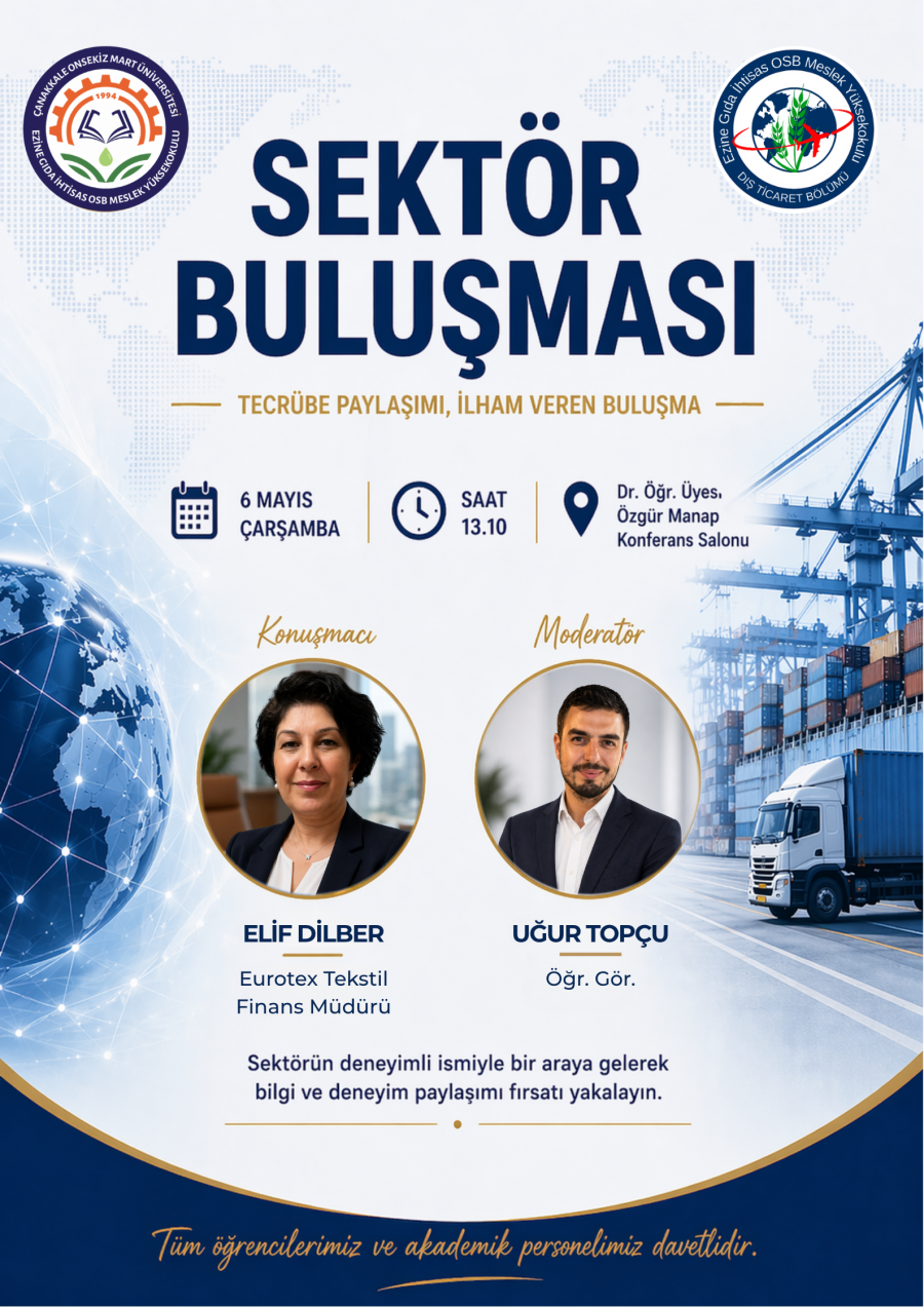 Ezine Gıda İhtisas OSB Meslek Yüksekokulu Dış Ticaret Bölümü tarafından düzenlenen “Sektör Buluşması” etkinliği kapsamında, sektörün deneyimli isimlerinden Eurotex Tekstil Finans Müdürü Elif Dilber öğrencilerimizle bir araya gelecektir.