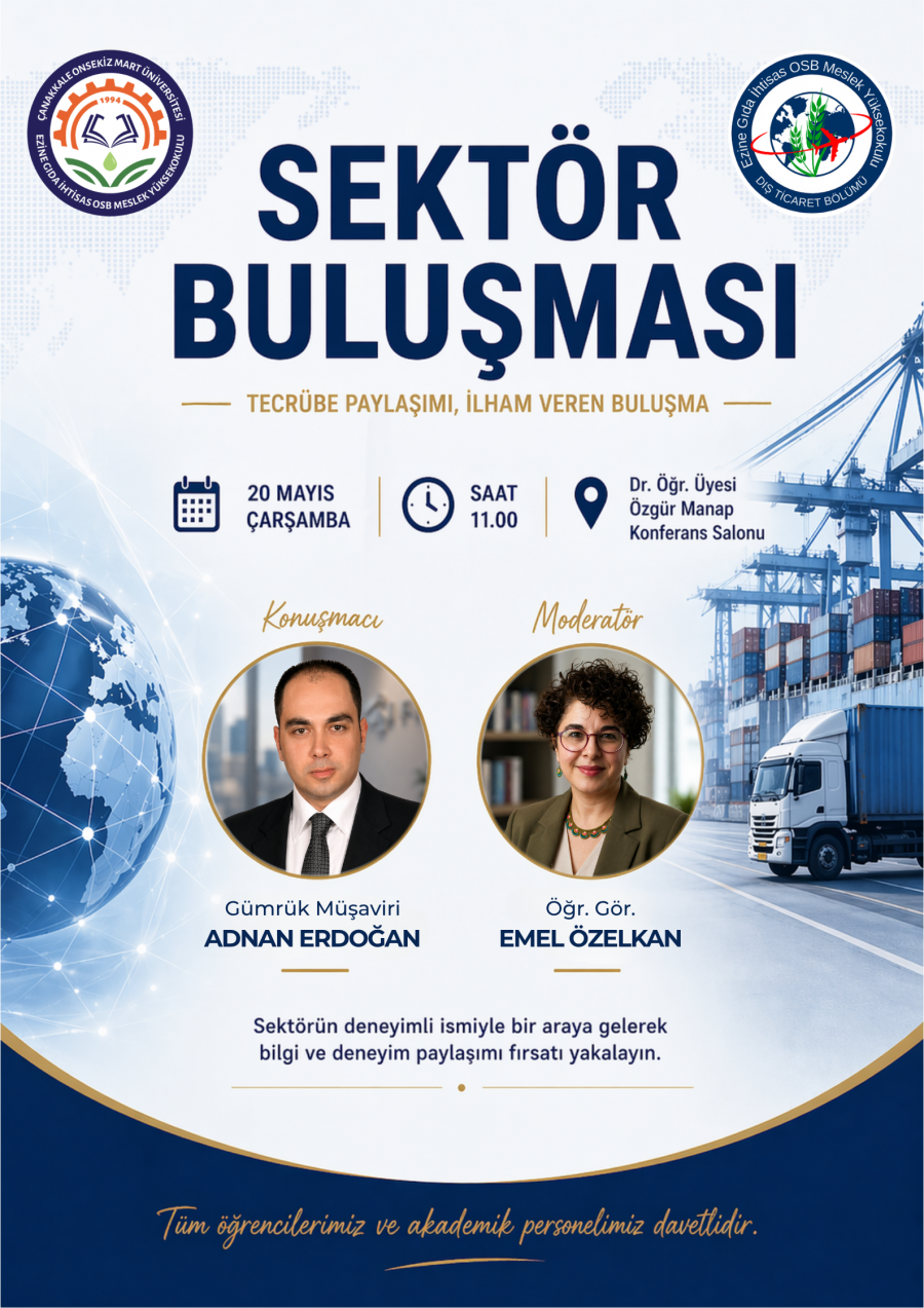 Ezine Gıda İhtisas OSB Meslek Yüksekokulu Dış Ticaret Bölümü tarafından düzenlenen “Sektör Buluşması” etkinliğinde, sektörün deneyimli ismi Elif Dilber öğrencilerle bir araya gelerek tecrübe ve bilgi paylaşımında bulunacaktır.